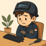 クリスマス目前、溶接マンの父親が娘のプレゼント選びに悩んでいる様子。作業着のままパソコンに向かい、チェキとタイプライター風キーボードの画像を見比べて頭を抱える。背景には小さなクリスマスツリーと工具が並び、仕事と父親業の両立に奮闘する姿をユーモラスに描いた構図。 ライフスタイル