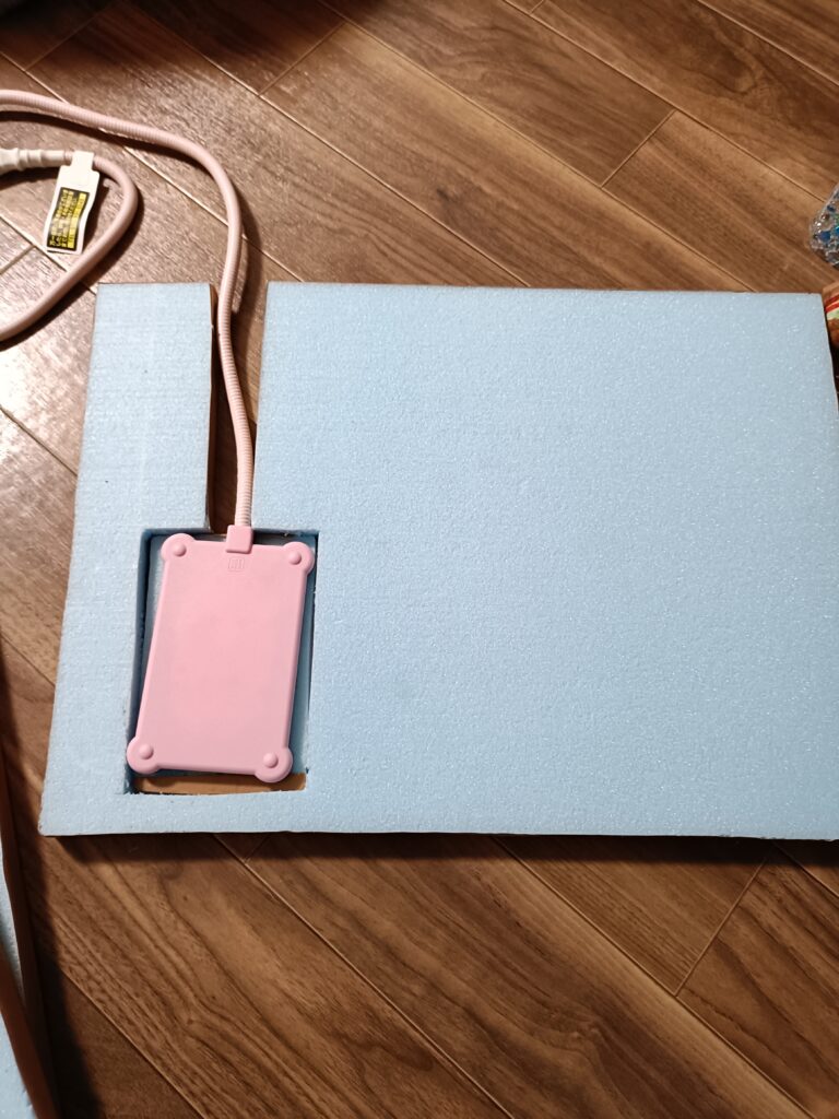 断熱材をケージの下に仕込む。断熱材を切り欠きして、ハムスター用の小型ヒーターをセット。