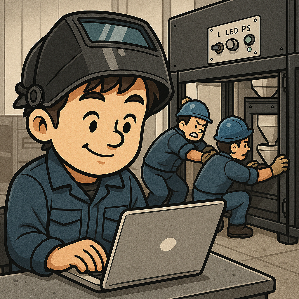 私ももちろん、時には溶接をして、鉄に穴をあけたり切断したり、ペンキを塗ったり吹付け塗装をしたり、その翌日には屋根に上って葺き替え作業や雨樋の交換・修理をしたり、そのまた翌日には機械の据付に行ったりもします。
